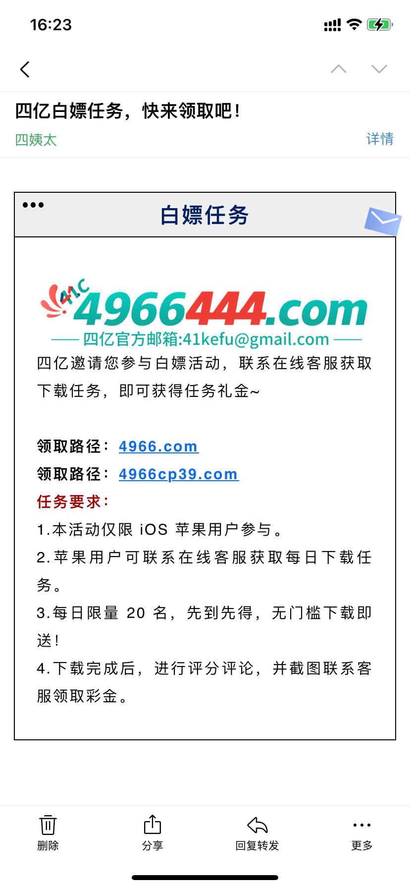 之前收到过邮件,不是当天的不能领,今天收到领了 8 出了 100。 地址 4966.com 可以看看邮箱,有就是没有就是没有,勿充值。